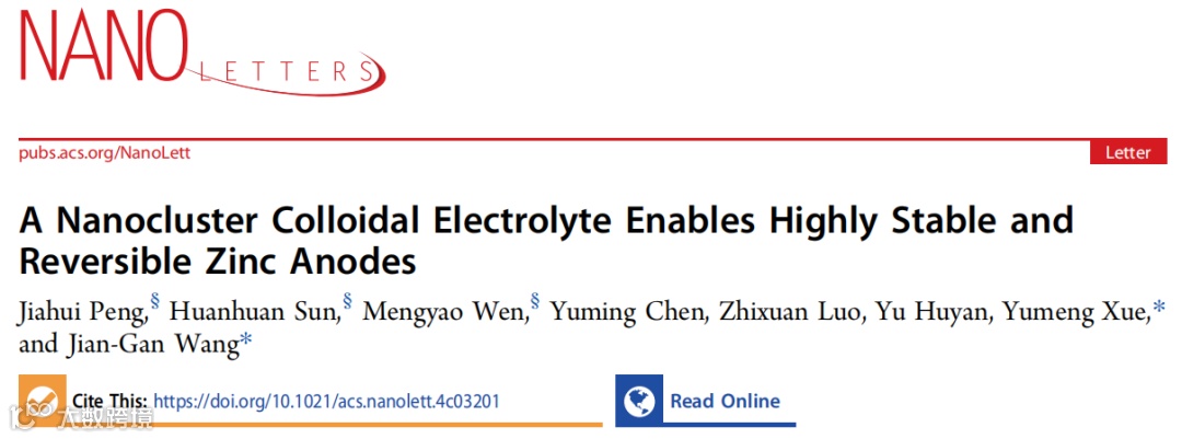 近日,西北工业大学的王建淦教授和薛语萌副教授团队在国际纳米领域顶级期刊Nano Letters 上发表了题为“A Nanocluster Colloidal Electrolyte Enables Highly Stable and Reversible Zinc Anodes”的研究论文。该研究提出了一种纳米团簇胶体电解液策略,用于构建耐腐蚀、无枝晶锌负极。胶体电解液中的铜纳米团簇(CuNC)在锌负极表面原位形成了亲锌保护层,有效引导了锌离子的均匀沉积,抑制了腐蚀和析氢等副反应。此外,CuNC提高了电解液的电导率,增强了锌离子的传输/扩散动力学。基于该策略,锌负极在2100次循环后库仑效率仍然高达99.8%,实现长达2200 h的超稳定耐久性。这项研究成果为高性能锌离子电池的开发提供了新的思路,未来有望在储能领域发挥重要作用。