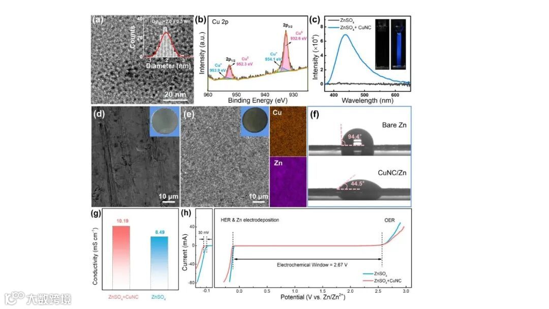 Figure 2. (a) TEM image (inset: nanocluster size distribution), (b) XPS high-resolution spectrum of Cu 2p of CuNC. (c) Fluorescence spectrum (inset: digital image of electrolyte under UV-light irradiation (365 nm)), SEM and digital images of (d) pristine Zn and (e) CuNC/Zn along with the corresponding elemental mappings. (f) Contact angles of ZnSO4 electrolyte on bare Zn and CuNC/Zn plates. (g) Ionic conductivity, and (h) electrochemical window of ZnSO4electrolyte with and without CuNC.