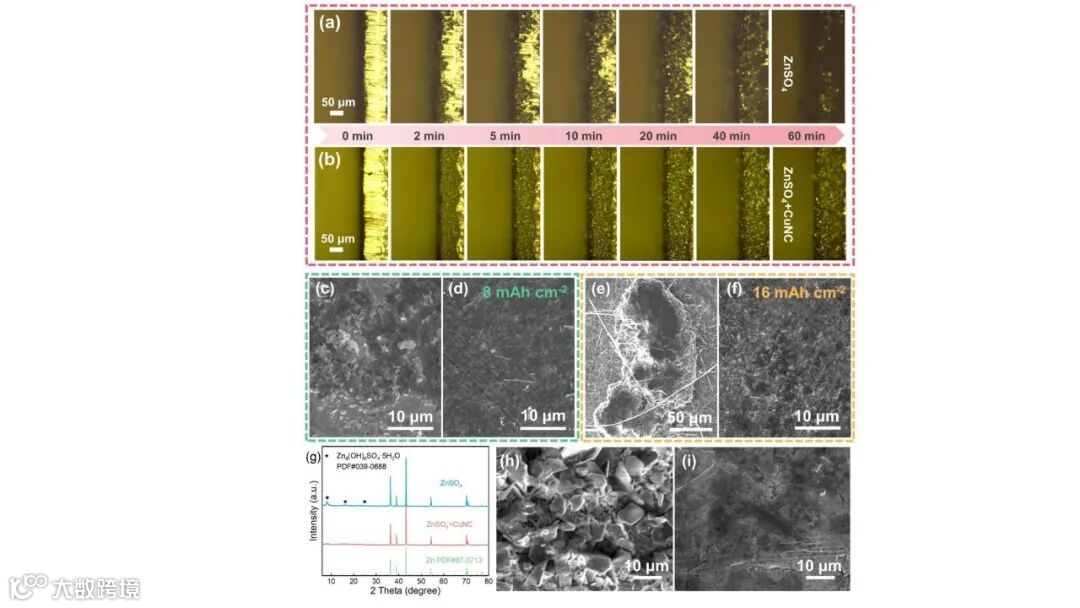 Figure 4. In situ optical microscopy of zinc electrodeposition in (a) ZnSO4 and (b) CuNC colloidal electrolyte. SEM images of Zn anode at the areal capacity of 8 and 16 mAh cm-2 in (c, e) ZnSO4 and (d, f) CuNC colloidal electrolyte. (g) XRD patterns of Zn plates after 50 cycles at 5 mA cm-2, 2.5 mA h cm-2 in different electrolytes, the corresponding SEM images of anodes tested in (h) ZnSO4 and (i) CuNC colloidal electrolyte.