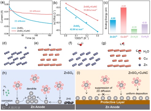 Figure 5. (a) CA curves, (b) desolvation energy barriers of hydrated Zn2+ in ZnSO4and ZnSO4/CuNC electrolytes. (c) Adsorption energies and (d-g) optimized adsorption models of Zn atom and H2O molecule on Zn (101) and Cu (111) substrates. Schematic illustration of Zn plating process using (h) ZnSO4and (i) ZnSO4/CuNC electrolytes.