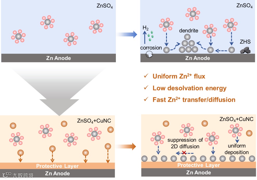 Figure 1. Schematic Zn2+ deposition on Zn anode in ZnSO4 and CuNC colloidal electrolytes.