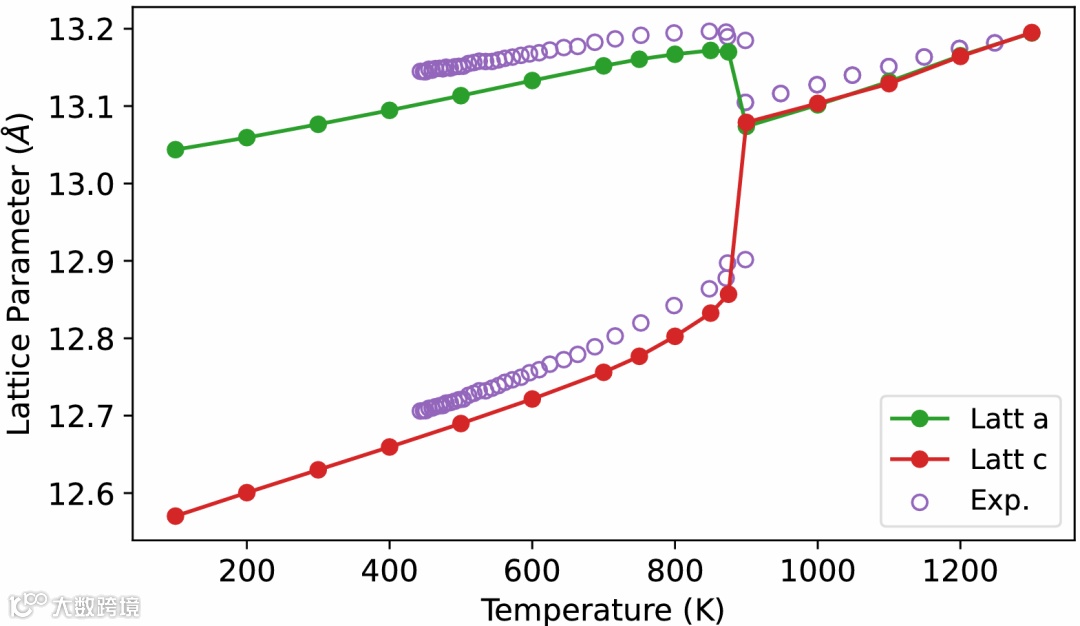 模拟结果显示,在温度约为900K时, LLZO发生了四方-立方相变(图一),其晶格参数发生显著变化,a和b轴突然减小,c轴增大,形成立方晶胞(a = b = c),这一变化清晰地表明了从四方LLZO 到 立方LLZO 的结构转变,且与 Chen 等人的实验数据高度吻合(紫色空心圆圈),有力地验证了模拟方法在描述相变行为方面的准确性。