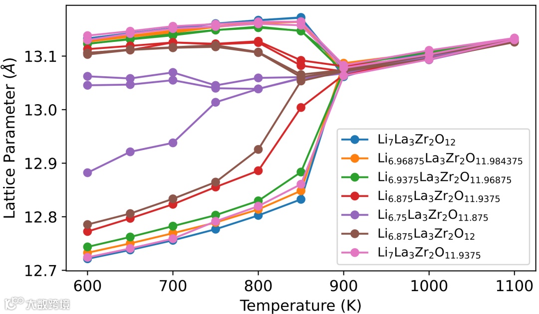 图一. 计算的LLZO晶格参数的演变。紫色空心圆圈为实验的晶格参数。