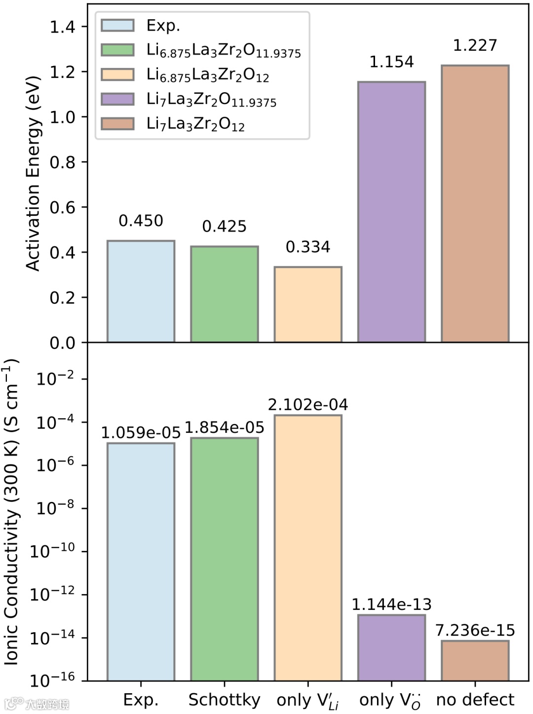 图三:不同缺陷类型的四方相 LLZO 中锂离子的活化能和离子电导率。
