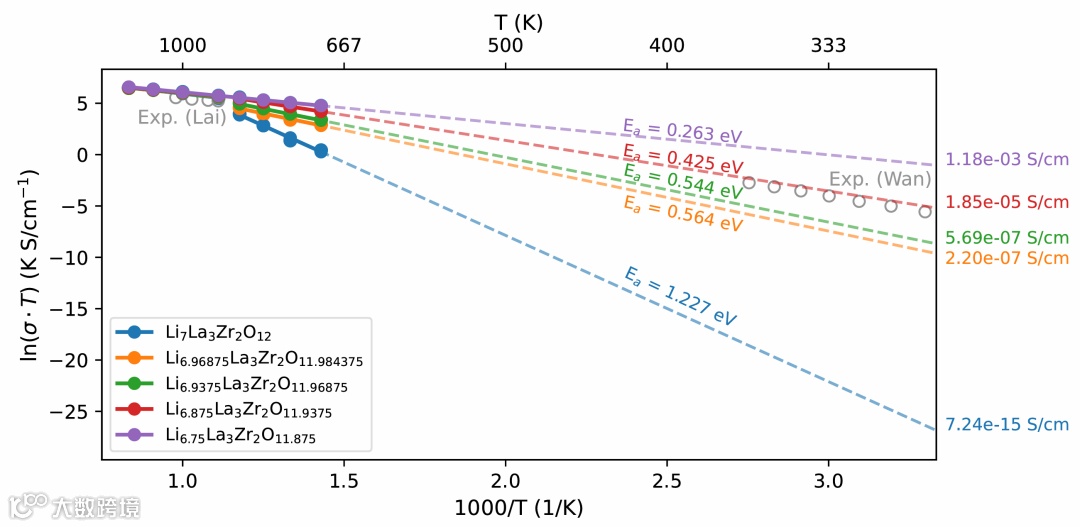 图二:不同锂非化学计量下LLZO 中 锂离子扩散的 Arrhenius 图。灰色空心圆为实验结果。