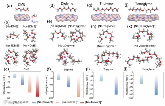 我们分别选取了乙二醇二甲醚(DME),二乙二醇二甲醚(Diglyme),三乙二醇二甲醚(Triglyme),四乙二醇二甲醚(Tetraglyme)作为研究对象,系统分析了其在溶剂化过程中的形变和溶剂化能。首先,由于链醚上有多个氧,当和钠离子溶剂化的过程中,链醚会发生弯折,降低体系的能量。根据不同链醚含氧数的差异,钠离子和溶剂的配位数会有差异,短链的DME的配位数能达到4,二长链的Tetraglyme只有2。另外,溶剂化自由能也随着溶剂配位数的改变而改变。为了适应低温环境,筛选合适的醚类溶剂,降低去溶剂化能,并深入理解其背后的机制对于醚类电解液的发展具有重要意义。