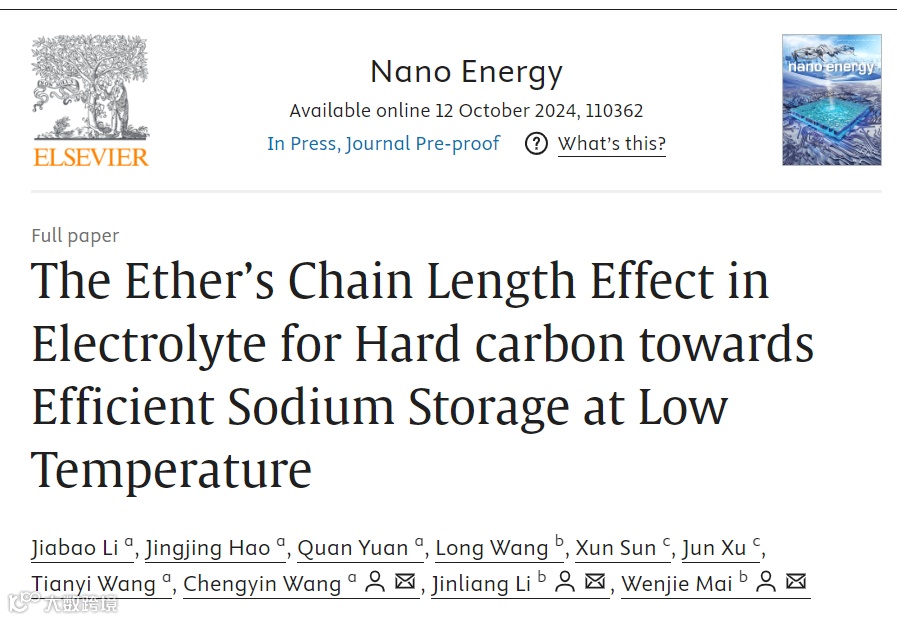 近日,来自扬州大学的李家宝博士和王赪胤教授联合暨南大学黎晋良研究员和麦文杰教授在Nano Energy 上发表了题为“The Ether’s Chain Length Effect in Electrolyte for Hard carbon towards Efficient Sodium Storage at Low Temperature” 的研究文章。改文章系统分析了醚类电解液中醚类溶剂链长对于反应动力学,界面组成/结构,以及钠离子电池低温性能之间的构效关系。