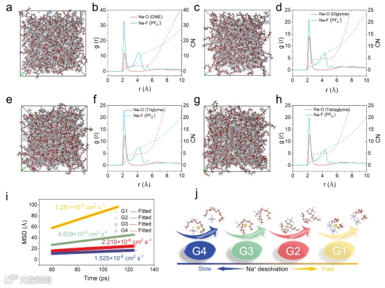 分子动力学模拟的结果表明通过减少溶剂链长可以构建弱溶剂化电解液,促进阴离子溶剂化,从而有助于实现快速的去溶剂化和在硬碳负极表面形成阴离子衍生的SEI膜,提升界面动力学和稳定性。进一步分析离子迁移速率发现由短链溶剂组成的电解液可以提升钠离子在液相电解液中的迁移。