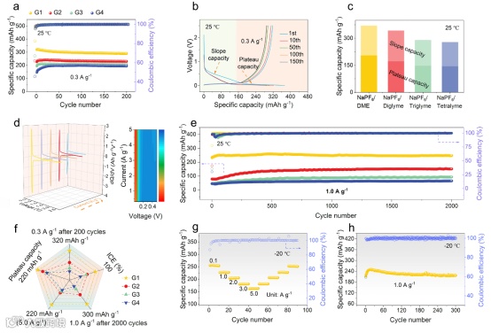 通过系统比较硬碳在不同链长电解液中的性能,我们可以发现:在由短链溶剂组成电解液中,硬碳在常温和低温下都展现出最佳的性能。与此同时,平台容量也大大增加;短链溶剂的电解液也有助于维持硬碳中稳定的钠离子嵌入和脱出。值得注意的是,在-20度的低温下,倍率测试中5.0 A g-1的电流密度下,硬碳依旧表现出较高的容量,再次凸显出溶剂选择对于硬碳和醚类电解液匹配性的重要作用。