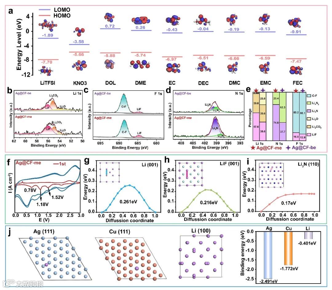 图3. (a) KNO3、LiTFSI和传统醚、酯溶剂的LUMO-HOMO能级;放电至0 V后Ag@CF-be和Ag@CF-me表面的(b) Li、(c) F、(d) N的XPS光谱和(e) Li、N、F元素各组分在总光谱中的比例;(f) Ag@CF-me电极前三次循环的CV曲线;Li在(g) Li(100)、(h) LiF(001)、(i) Li3N(110)表面的吸附模型及相应的扩散势垒;(j) Ag(111)、Cu(111)、Li(100)表面吸附Li的结构优化及结合能比较。