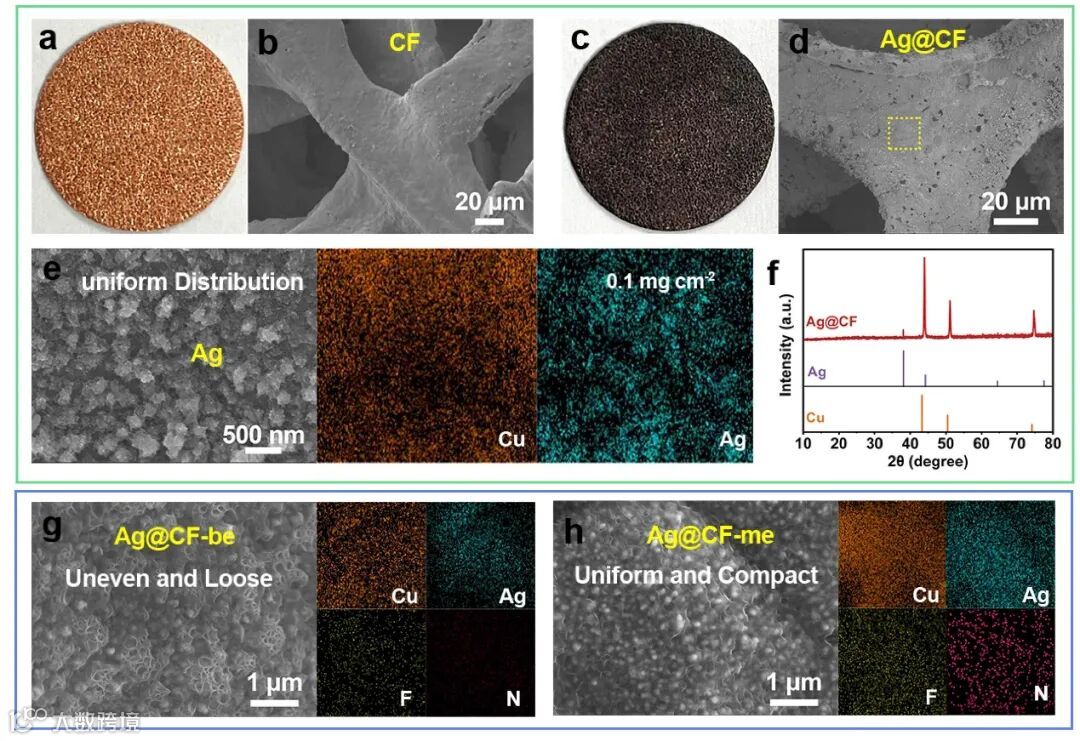 图2. (a,b) CF和(c,d) Ag@CF的光学照片和SEM图像;(e) Ag@CF的表面放大SEM和元素EDS, (f) XRD图谱。(g)空白电解质(be)和(h)改性电解质(me)中Ag@CF放电至0 V后的SEM图像和元素能谱图。