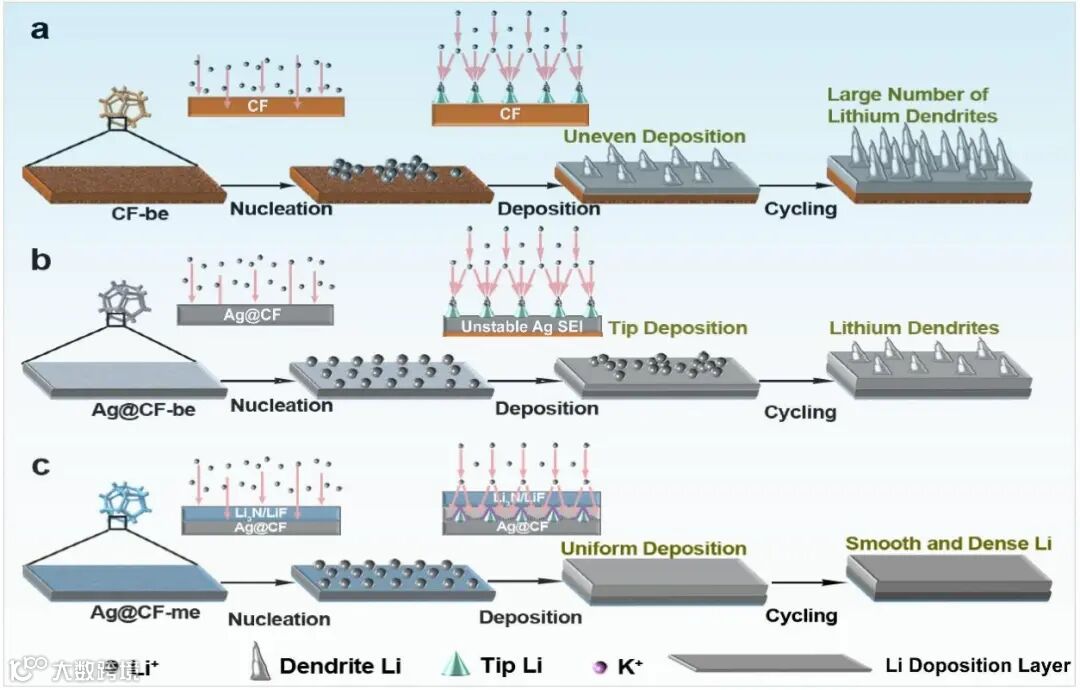 图1. 锂在不同骨架/电解液体系中的成核、沉积及循环过程示意图