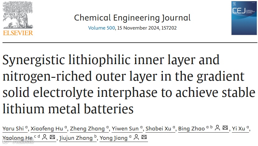 近日,上海大学蒋永研究员、赵兵研究员和何耀龙老师合作,在Chemical Engineering Journal 上发表题为“Synergistic lithiophilic inner layer and nitrogen-riched outer layer in the gradient solid electrolyte interphase to achieve stable lithium metal batteries”的研究工作。