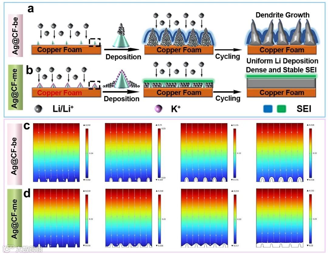 图4. (a, b)基于“阳离子屏蔽”机制的锂沉积过程示意图。相场模型模拟结果:(c) Ag@CF-be和(d) Ag@CF-me的电流密度分布和锂沉积行为。