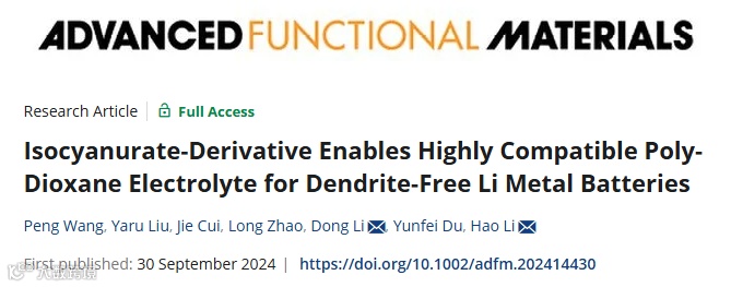 Peng Wang#, Yaru Liu#, Jie Cui, Long Zhao, Dong Li*, Yunfei Du, Hao Li*, Isocyanurate-Derivative Enables Highly Compatible Poly-Dioxane Electrolyte for Dendrite-Free Li Metal Batteries, Advanced Functional Materials 2024.