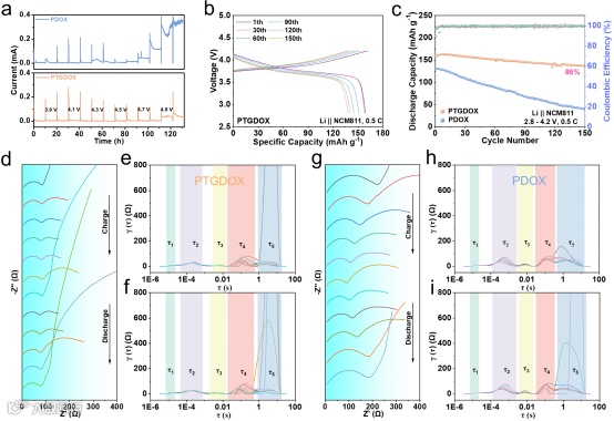 图6 a)PDOX和PTGDOX基Li||NMC811电池的EFA曲线。b-c) Li||NMC811电池的循环性能。d-f) Li|PTGDOX|NCM811和g-i) Li|PDOX|NCM811电池的原位EIS及相应的DRT变换图。