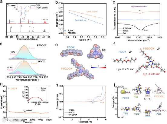 图2 a)TGI和TGI/LiTFSI的13C核磁共振。b)PDOX和PTGDOX的离子电导率。c, d)PDOX和PTGDOX样品的FT-IR光谱。e)PDOX、TGI和PTGDOX的静电势分布。f)聚合物基体与Li+吸附能计算。g)Li|PTGDOX|Li对称电池的极化曲线和EIS曲线。h)PDOX和PTGDOX样品的LSV曲线。i)PDOX、TGI、LiTFSI和PTGDOX的前线轨道能级计算。