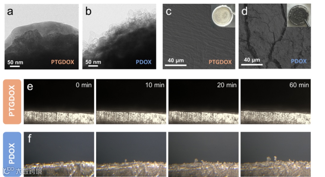 图4 a) PTGDOX和b)PDOX在15次循环后Li电极的SEI结构的HR-TEM图像。c-d)循环500h后锂对称电池中锂电极表面的FE-SEM图像。e-f)锂对称电池在1.0 mA cm-2下的锂枝晶生长情况。