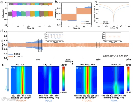 图3 a)Li|PTGDOX|Li电池倍率性能测试。b) 0.2 mA cm-2下Li||Li电池的GITT电压分布。c) 用PDOX和PTGDOX组装的Li||Li对称电池的Tafel图。d) Li||Li对称电池在1.0 mAh cm-2下的剥落/沉积测试。Li||Li电池中循环500 h后锂金属电极的X射线光电子能谱图:e)F 1s和f)N 1s。