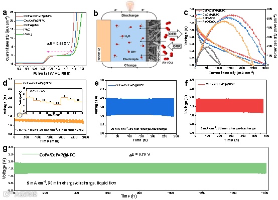 由于其独特的结构设计,所制备的CoFe/CoFeP@NPC催化剂表现出卓越的ORR/OER双功能活性,其性能优于贵金属基催化剂Pt/C+RuO₂以及大多数近期报道的先进催化剂。组装的可充电ZABs表现出高功率密度(550 mW cm−2)、低充放电电压差(0.7 V),以及超过1600小时的超长循环寿命。