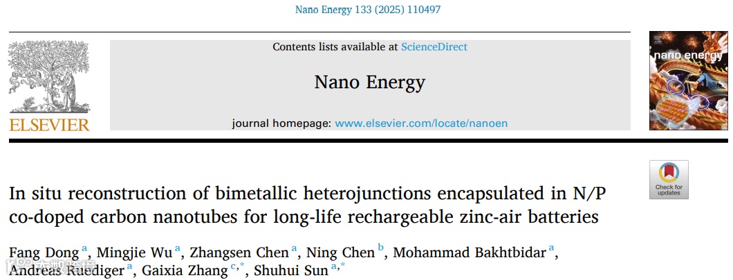 近日,来自加拿大国立科学研究院的孙书会教授与魁北克大学高等工程技术学院的张改霞教授合作,在国际知名期刊Nano Energy上发表题为“In Situ Reconstruction of Bimetallic Heterojunctions Encapsulated in N/P Co-Doped Carbon Nanotubes for Long-life Rechargeable Zinc-Air Batteries”的文章。