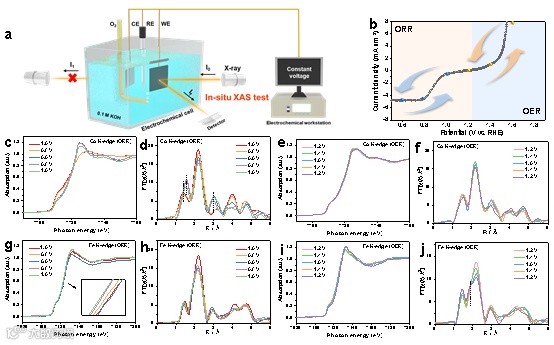 为了进一步探索CoFe/CoFeP@NPC中Co和Fe的成键构型,采用X射线吸收近边结构(XANES)和k边扩展X射线吸收精细结构(EXAFS)进行原位测试。催化剂的原位表征在ORR(1.0 ~ 0.6 ~ 1.0 V vs RHE)和OER(1.2 ~ 1.6 ~ 1.2 V vs RHE)的电位窗口内进行。原位观测表明,在初始阶段,金属Co仅在有限深度内发生部分活性位点的重建,而Fe的重构在浸入电解液后迅速启动。随后的研究表明,金属Co和Fe都经历了从部分到完全重构的过程。此外,磷掺杂不仅调控了碳纳米管的电荷分布以提高ORR活性,还在金属磷化物的溶解与重组过程中促进了过渡金属的重构生成活性位点。