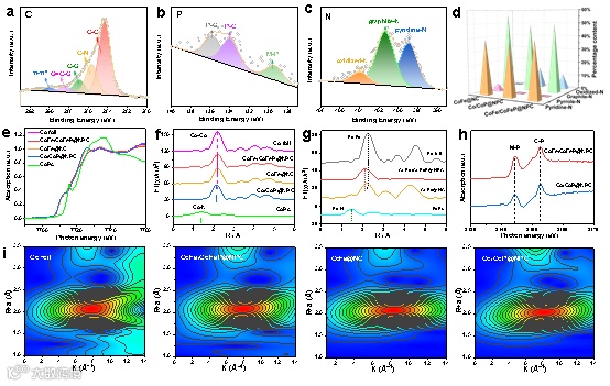本文将双金属异质结纳米颗粒封装于杂原子掺杂的碳纳米管中,这不仅为有效防止纳米颗粒的溶解和腐蚀提供了一层保护性的“盔甲”,增强了材料结构的长期稳定性。此外,碳纳米管的随机堆叠降低了扩散阻力,促进了质量和电子的传输,最终确保了催化反应的高效进行。相比于对比催化剂CoFe@NC和 Co/CoP@NPC, 双功能催化剂CoFe/CoFeP@NPC具有更多缺陷碳,吡啶氮和石墨氮,这些被认为是催化反应动力学、传质效率和催化剂稳定性显著改善的原因。