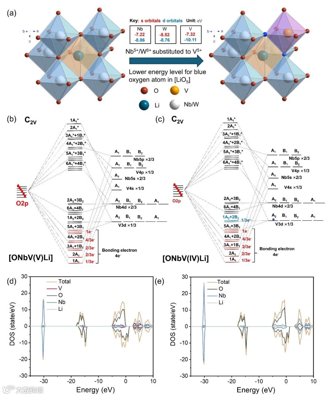 基于此,作者提出以下观点:在以[ONbV(V)Li]的配位环境中,O为中心原子,配体V取代Nb,使得前线能级降低,[LiO5]中的O原子s、px、pz轨道与Li的s轨道的相互作用强度减弱,从而使得O原子对Li具有较低的吸附强度,使得[LiO5]配位结构中的Li+更易脱出。对于V5+掺杂NbWO动力学性能优于V4+掺杂NbWO,同样能够通过能级结构的变化改变了O对Li的吸附强度这一观点进行分析解释。相比V5+掺杂,V4+掺杂在d轨道中存在单一电子。在[ONbV(IV)Li]中, V4+在d轨道中的电子同样参与O的成键,使得成键电子数由4e-升至4.5 e-,结构整体能级有所提高,对Li+的吸附强度提高,不利于Li+的迁移,从而动力学性能有所下降。为验证能级分析结果,采用DFT对掺杂前后及嵌锂前后的局部结构态密度(DOS)进行计算,结果如图4(d)-(e)所示。通过对比发现,Li-V-Nb-O结构能级相对Li-Nb-O结构能级向低能量方向偏移,与能级图分析结果相一致,验证了该研究提出的观点。