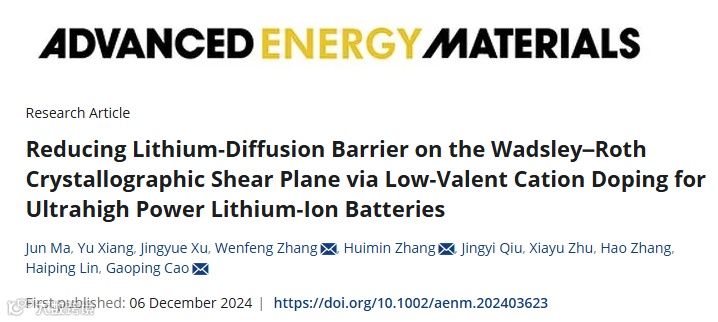 J. Ma, Y. Xiang, J. Xu, W. Zhang, H. Zhang, J. Qiu, X. Zhu, H. Zhang, H. Lin, G. Cao, Reducing Lithium-Diffusion Barrier on the Wadsley–Roth Crystallographic Shear Plane via Low-Valent Cation Doping for Ultrahigh Power Lithium-Ion Batteries. Adv. Energy Mater. 2024, 2403623.