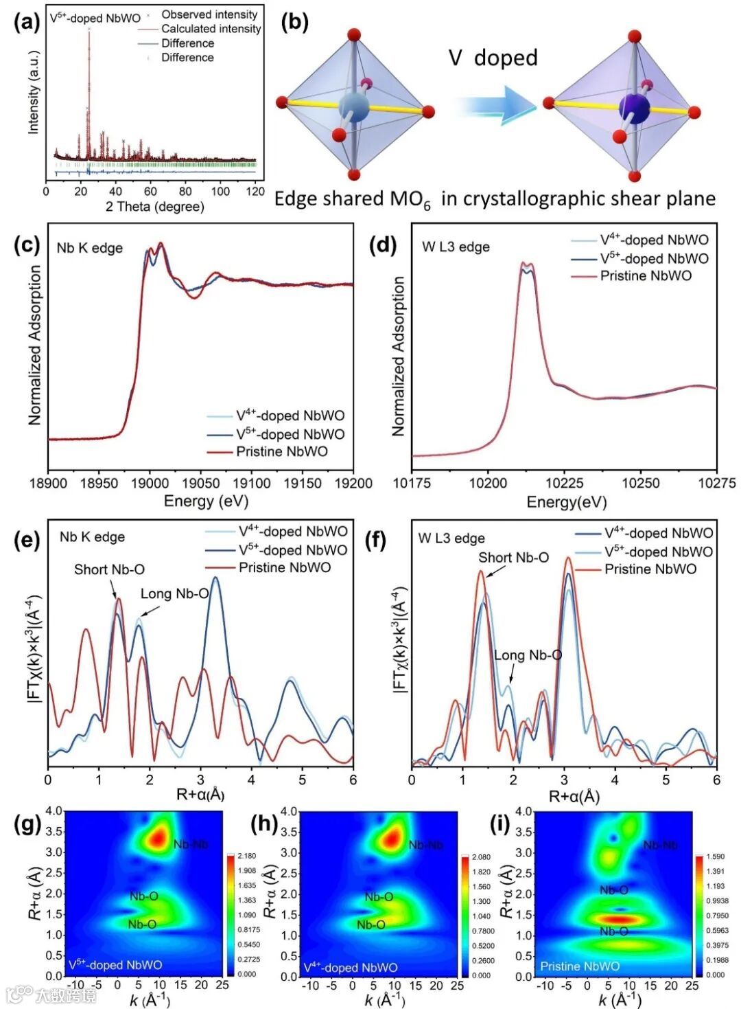 图2 (a)V5+掺杂NbWO的XRD精修;(b)V5+掺杂后八面体结构变化示意图;(c)-(d)V掺杂NbWO及NbWO的XANES能谱;(e)-(f) V掺杂NbWO及NbWO的EXAFS能谱;(g)-(i) V掺杂NbWO及NbWO的NbK边小角变换