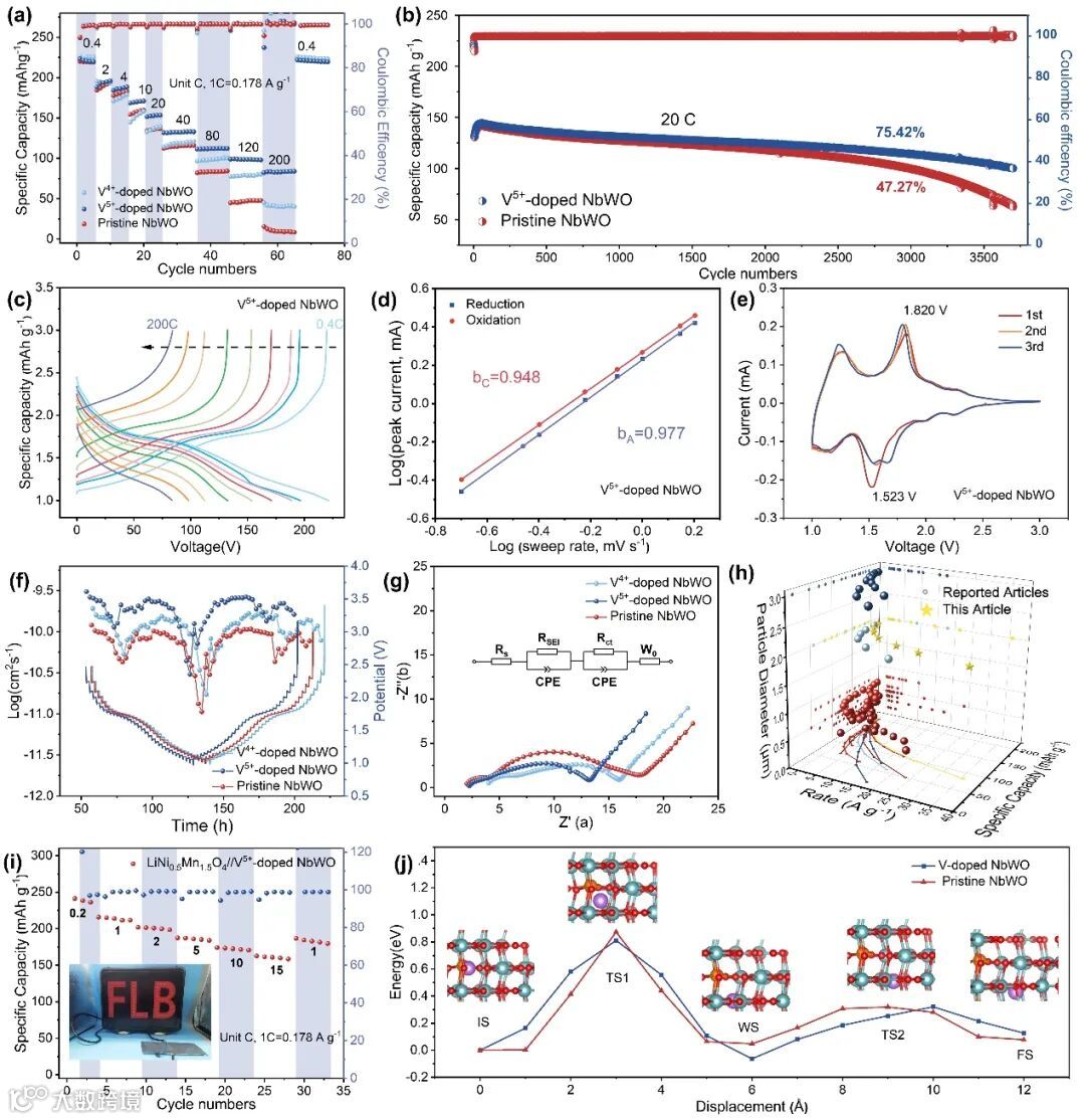 图3(a)V掺杂NbWO和NbWO的倍率性能对比;(b)V掺杂NbWO和NbWO的高倍率下的循环性能对比;(c)V5+掺杂NbWO的充放电曲线(d)V5+掺杂NbWO通过不同扫速CV曲线计算得到的bA、bC值;(e)V5+掺杂NbWO前三圈CV曲线;(f)V掺杂NbWO和NbWO的GITT曲线对比;(g)V掺杂NbWO和NbWO的EIS曲线对比;(h)V5+掺杂NbWO与其他文献报道材料性能对比;(i)V5+-doped NbWO//LiNi0.5Mn1.5O4 软包电池倍率性能;(j)V掺杂NbWO和NbWO的Li+迁移势垒计算对比;