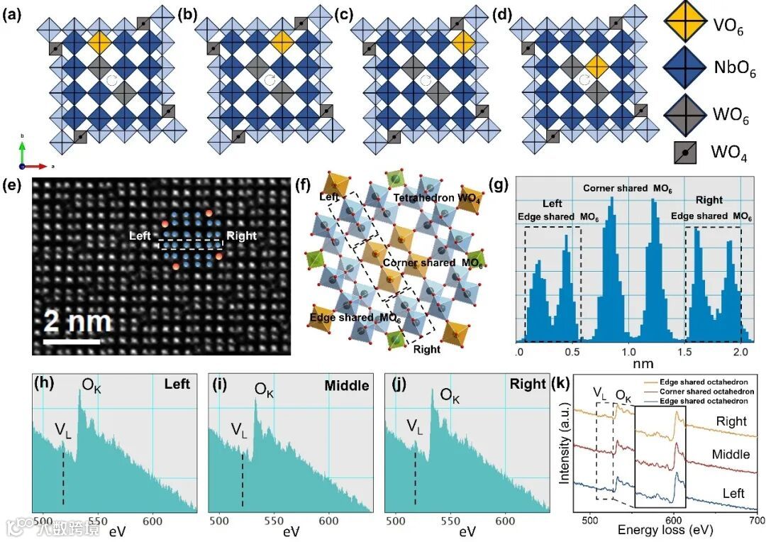 图11(a)-(d) 低价态阳离子V5+分布在Wadsley-Roth结构NbWO不同位点的理论计算模型;(e)V5+掺杂的球差电镜图像;(f)Wadsley-Roth结构NbWO结构示意图;(g)NbWO不同位点z衬度对比;(h)-(j) Wadsley-Roth结构NbWO中不同位点EELS能谱;(k)NbWO中共边八面体和共角八面体VL的EELS能谱对比