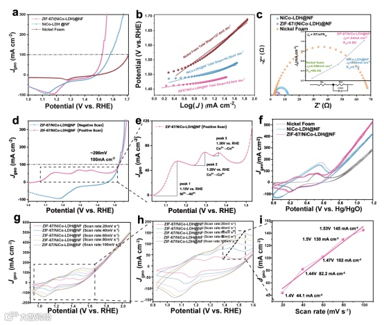 在EDS mapping中能够观察到明显的Ni元素与Co、C、N元素的分布差异,后三种元素的分布与ZIF-67材料相关,并分布成与十字架形貌相匹配的轮廓。在Co 2p的高分辨率XPS谱中(图2g),ZIF-67生长于NiCo-LDH之后,其更宽的2p 3/2的峰需要拟合出三个峰,分别对应二价、三价和四价的钴物种。在图2j中,作者用一个简单的示意图来说明高价钴种的出现和稳定:在NiCo-LDH层中,最初存在二价和三价钴物种,大部分来自Co(OH)2和CoOOH;在大电流的操作环境下,部分二价和三价钴就地转化为较高价态的钴物种并溶出。现有的文献表明,四价钴是特别强力的OER活性位点,但是Co3+/Co4+比Co2+/Co3+不稳定得多,因为因为多余的Co3+迅速还原为Co2+,导致四价钴难以稳定。根据以往的研究,通过N元素稳定化高价态的Co物种是一种可行的方案。因此,在阳极电化学沉积和形成ZIF-67的过程中,引入N元素与Co元素配合实现了对三价钴和(或)四价钴的稳定化。