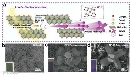 图1. 制备方案及形貌表征。a)阳极腐蚀法在NiCo-LDH表面生长ZIF-67层的过程示意图。b) NiCo-LDH@NF, ZIF-67/NiCo-LDH@NF的c)十二面体形貌和d)十字架形貌的SEM图像。