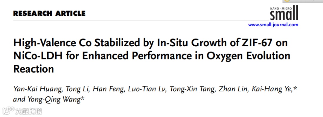 近日,来自中山大学的王永庆副教授与广东工业大学的叶凯航副教授合作,在国际知名期刊Small上发表题为“High-Valence Co Stabilized by In-Situ Growth of ZIF-67 on NiCo-LDH for Enhanced Performance in Oxygen Evolution Reaction”的研究文章。该文章开发了一种在NiCo-LDH的基础上通过阳极腐蚀的方法来诱导金属阳离子的可控溶出并于镀液中的配体发生配位,实现了ZIF-67材料的可控原位生长,并能够实现MOFs材料在电催化领域中直接应用时展现出高OER性能。