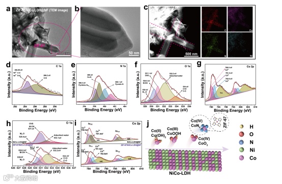 图2. ZIF-67/NiCo-LDH@NF电极的TEM和XPS表征以及在氮元素的配位下诱导形成并稳定化高价钴的示意图。d-g)分别为ZIF-67/NiCo-LDH@NF的C-1s、N-1s、O-1s和Co-2p XPS光谱。h)和i)分别为ZIF-67/NiCo-LDH@NF和NiCo-LDH@NF相对照的O-1s和Co-2p XPS光谱。
