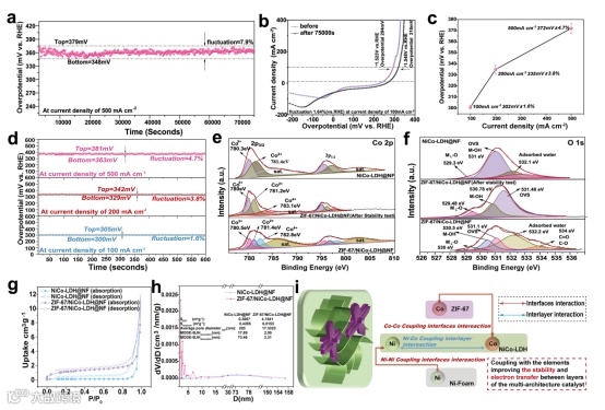 在工业级的产业化应用中,高电流密度下的OER过程会使催化剂承受极端的工作条件和巨大的质量传输压力,导致催化剂表面形貌和化学成分的破坏。因此,高电流密度下的稳定性是评价其性能的一个重要方面。在图4a中,该催化剂在500 mA cm−2的电流密度下进行了恒持续时间为75000s恒电流计时电位法测试,过电位波动仅为7.9%,表现出优异的稳定性。为了研究OER过程中催化剂的化学重构和结构重组,研究了NiCo-LDH@NF以及ZIF-67/NiCo-LDH@NF在稳定性测试前后的XPS光谱,反应后催化剂表面仍然保留着一个Co4+峰,但是随着N元素的损失,相比起反应前,Co4+峰的强度减弱,这是由于N元素起到了稳定Co4+的作用降低所导致。利用N2吸附-解吸等温线分析了加入ZIF-67后孔隙体积和孔径分布的变化(图4g,h)。结果表明,ZIF-67的掺入带来了引入了大量的2-10nm的孔结构,显著提高了催化剂的比表面积。