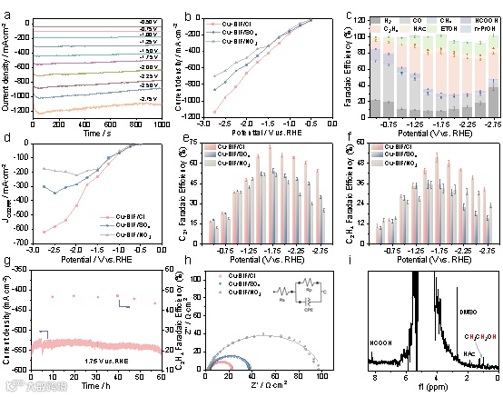 图 3 (a) 不同电位下Cu‒BIF/Cl的eCO2RR计时电流曲线;(b)稳态电流密度绘制的极化曲线;(c) Cu‒BIF/Cl电催化剂的eCO2RR产物的法拉第效率;(d) eCO2RR的分电流密度绘制的极化曲线;(e) C2+产物的法拉第效率;(f) C2H4的法拉第效率;(g) 在-1.75下Cu‒BIF/Cl的 eCO2RR的即时电流曲线;(h) -0.5 V下eCO₂RR的电化学阻抗谱(EIS);(i) -1.25 V下使用13CO2气体下Cu‒BIF/Cl的eCO2RR液相产物的核磁共振(NMR)谱图。