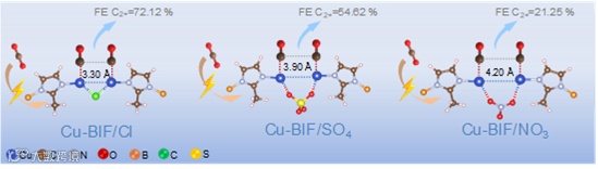 图2中XPS显示阴离子镶嵌在BIF骨架中,且Cu-BIF/Cl中Cu+/Cu2+的比值最大;利用同步辐射手段证明了Cu-BIF/Cl具有的不饱和配位,通过对同步辐射数据的模拟得到Cu-BIF/Cl的dCu-Cu为3.30 Å,Cu-BIF/SO4的dCu-Cu为3.90 Å以及Cu-BIF/NO3的dCu-Cu为4.20 Å。图3可以看到Cu-BIF/Cl总电流密度最高(1147.1 mA cm-2@-2.75 V, Cu-BIF/SO4样品872.6 mA cm-2和Cu-BIF/NO3样品706.8mA cm-2); 分电流密度539.0 mA cm-2@-1.75 V和FEC2+72.12% 也最优。Cu-BIF/Cl在eCO2RR测试60小时性能稳定,13C标定证明了C来源于CO2气体而并非材料中的C。