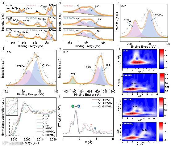 图2 高分辨XPS:(a) Cu 2p,(b) Cu LMM,(c) Cu‒BIF/Cl的Cl 2p,(d) Cu‒BIF/SO4的S 2p,(e) Cu‒BIF/NO3的N 2p;(f) Cu K边XANES,(g) EXAFS的R空间,星号表示Cu---Cu二原子距离;(h) Cu箔和Cu‒BIF的小波变换图
