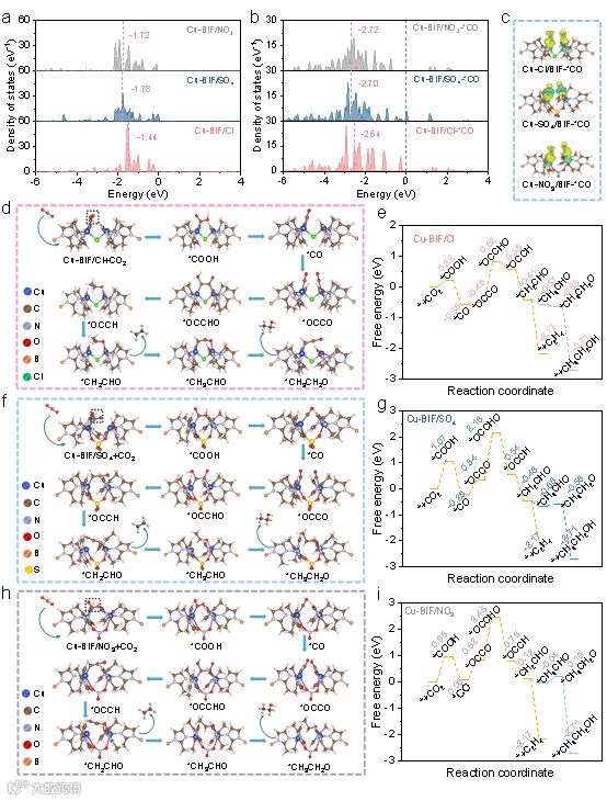 图4 (a)和(b)为*CO吸附前后Cu‒BIF中Cu 3d轨道的态密度;(c)为*CO吸附在Cu‒BIF 上的电荷密度差异图(黄色表示电子消耗,青色表示电子积累);(d)、(f)、(h) 为使用Cu‒BIF/Cl、Cu‒BIF/SO4和Cu‒BIF/NO3电催化剂进行eCO2RR的示意路径图;(e)、(g)、(i) 为在Cu‒BIF/Cl、Cu‒BIF/SO4和Cu‒BIF/NO3催化eCO2RR关键反应步骤的自由能图。