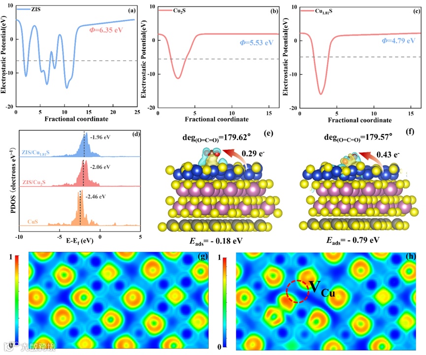 图7. (a)ZIS的WF图;(b)Cu2S的WF图;(c)Cu1.81S的WF图;(b)Cu2S,ZIS/Cu2S,ZIS/Cu1.81S的d带中心;(e,f)ZIS/Cu2S,ZIS/Cu1.81S吸附CO2的差分电荷密度图;(g,h)ZIS/Cu2S,ZIS/Cu1.81S的ELF图。