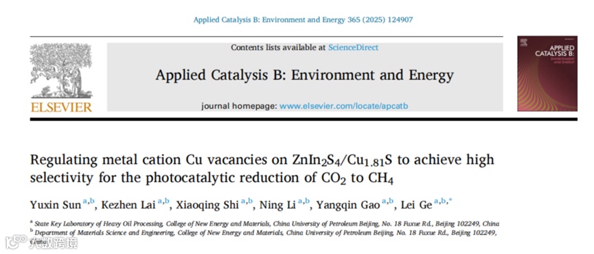 光催化还原CO2是一种实现碳中和的有效途径。为此,课题组戈磊教授指导硕士研究生孙雨鑫通过水热法合成了S型异质结ZnIn2S4/Cu2-xS催化剂,研究了助催化剂和Cu空位对光催化CO2活性和CH4选择性的影响规律。具有Cu空位的ZnIn2S4/Cu1.81S异质结催化剂表现出最佳的CH4产率,为23.4 μmol·g-1·h-1,选择性为98.11%。阳离子Cu空位诱导电子离域,调节周围原子的电子密度促进电子转移效率,从而加速CO2的质子化,并提高了CH4的产率和选择性。本研究将构建异质结和缺陷工程结合,为设计CO2还原的光催化剂提供了一种新方法。