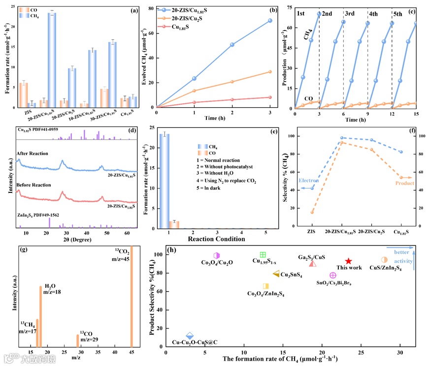 图4. (a)合成样品的光催化CO2RR产物产率;(b)Cu1.81S,ZIS/Cu2S,ZIS/Cu1.81S样品生成CH4的速率;(c)ZIS/Cu1.81S样品的CO2RR稳定性;(d)ZIS/Cu1.81S样品反应前后XRD谱图;(e)ZIS/Cu1.81S样品的对照实验;(f)合成样品的生成CH4的选择性;(g)CO2RR同位素标记实验图;(h)与不同催化剂产物选择性对比。