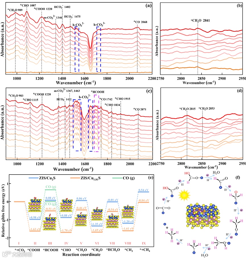 图8. (a,b)ZIS/Cu2S的原位红外光谱图;(c,d)ZIS/Cu1.81S的原位红外光谱图;(e)ZIS/Cu2S,ZIS/Cu1.81S CO2RR反应的吉布斯自由能;;(f)ZIS/Cu1.81S的反应路径图。