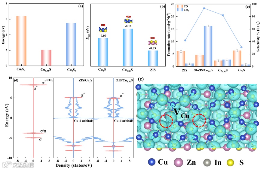 图1.(a)Cu7S4、Cu1.81S和Cu9S5的缺陷形成能;(b)CO2在Cu2S、Cu1.81S和ZIS上的吸附能;(c)合成样品的催化CO2还原产物产率;(d)ZIS/Cu2S和ZIS/Cu1.81S上CO2吸附的PDOS图;(e)ZIS/Cu1.81S结构的ELF图。