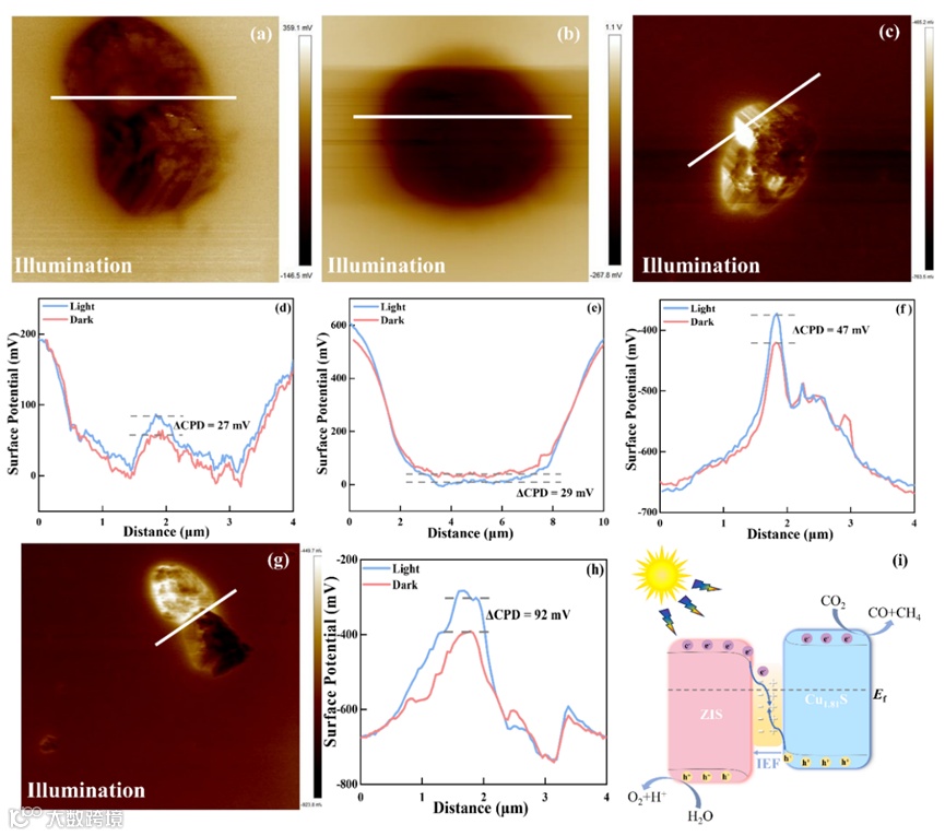 图6. (a)Cu2S在光照下的KPFM图;(b)ZIS在光照下的KPFM图;(c)ZIS/Cu2S在光照下的KPFM图;(d) Cu2S划线处的表面电压分布图;(e) ZIS划线处的表面电压分布图;(f) ZIS/Cu2S划线处的表面电压分布图;(g)ZIS/Cu1.81S在光照下的KPFM图;(h) ZIS/Cu1.81S划线处的表面电压分布图;(i)ZIS/Cu1.81S S型异质结机理图。