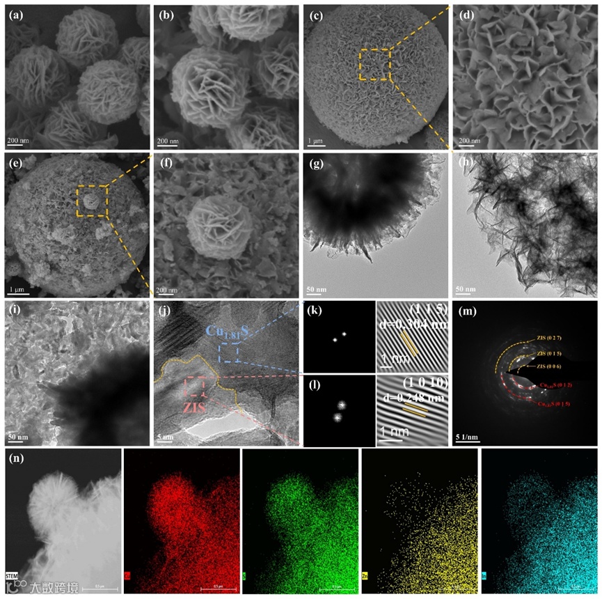 图3. (a)CuS前驱体和(b)Cu1.81S的SEM图;(c)ZIS和(d)ZIS局部放大的SEM图;(e)ZIS/Cu1.81S和(d)ZIS/Cu1.81S局部放大的SEM图;(g)Cu1.81S的TEM图;(h)ZIS的TEM图;(i)ZIS/Cu1.81S的TEM图;(j,k,l)ZIS/Cu1.81S的HRTEM和FFT图;(m)ZIS/Cu1.81S的SAED模式图;(n)ZIS/Cu1.81S的EDS图。