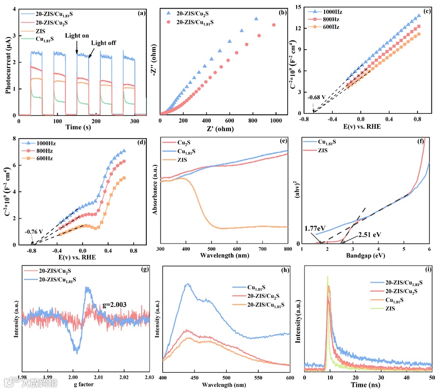 图5. (a)Cu1.81S,ZIS和ZIS/Cu1.81S的i-t曲线;(b)ZIS/Cu2S和ZIS/Cu1.81S的EIS曲线;(c)ZIS和(d)Cu1.81S的M-S曲线;(e)Cu2S,Cu1.81S和ZIS的紫外可见漫反射光谱;(f)Cu1.81S和ZIS的带隙;(g)ZIS/Cu2S和ZIS/Cu1.81S的EPR曲线;(h) ZIS,ZIS/Cu2S和ZIS/Cu1.81S的PL曲线;(i) ZIS, Cu1.81S, ZIS/Cu2S和ZIS/Cu1.81S的时间PL光谱。