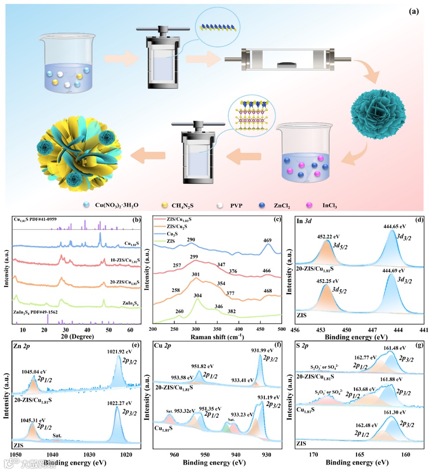 图2. (a) ZIS/Cu2-xS样品的合成路线;(b)合成的ZIS,Cu1.81S,ZIS/Cu2-xS样品的XRD谱图;(c)样品的拉曼图;(d)ZIS,ZIS/Cu1.81S样品对应的In 3d的XPS高分辨谱图;(e)Zn 2p的XPS高分辨谱图;(d)ZIS,ZIS/Cu1.81S样品对应的Cu 2p的XPS高分辨谱图;(e)S 2p的XPS高分辨谱图。